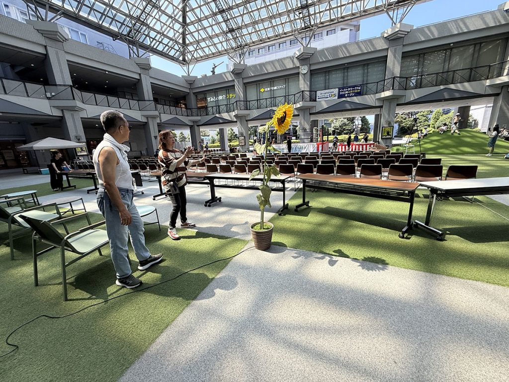 このひまわり、なんと冷却ミストなのです!水が出て周辺の温度を下げ、熱中症の予防に!