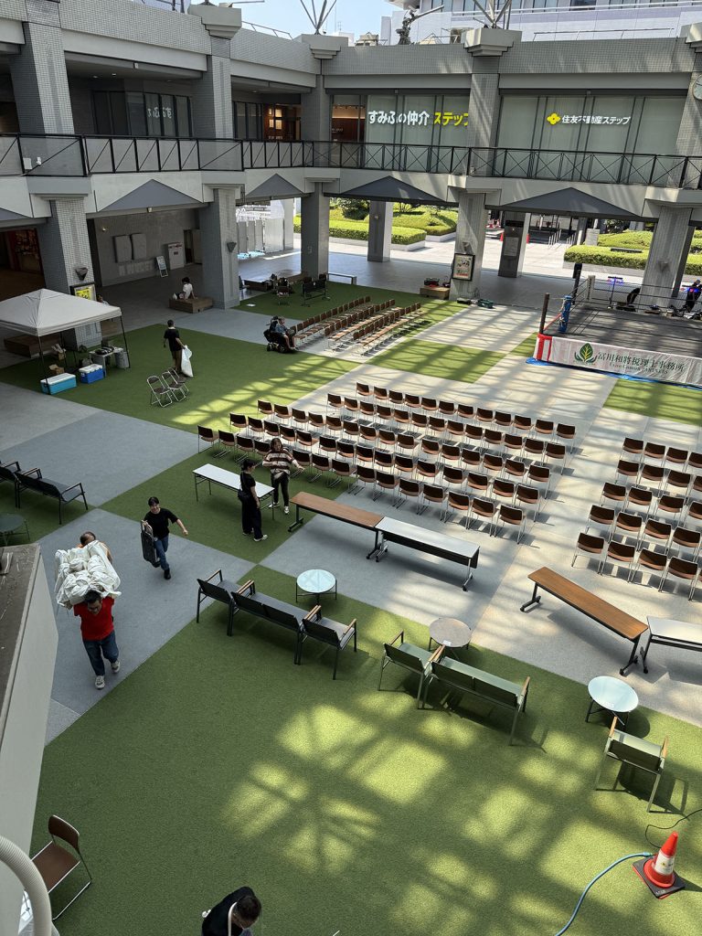 ダヴィンチ俱楽部のスタッフで、イスや机、テント等、会場全体の設営を行いました